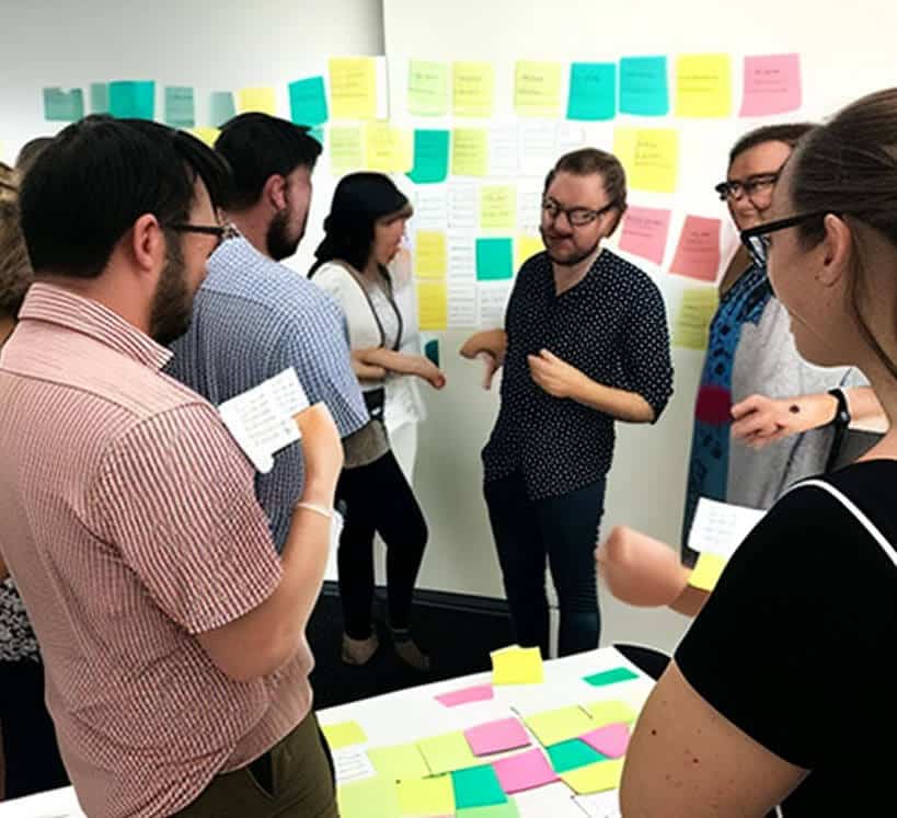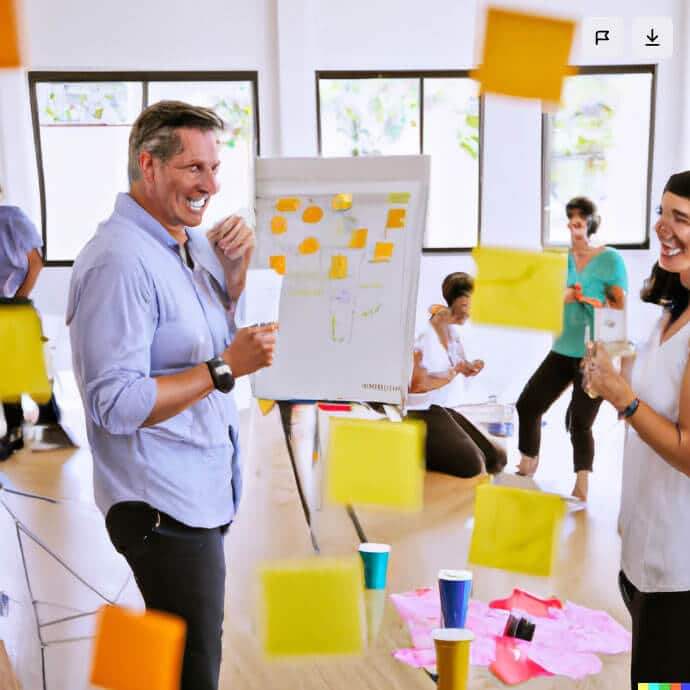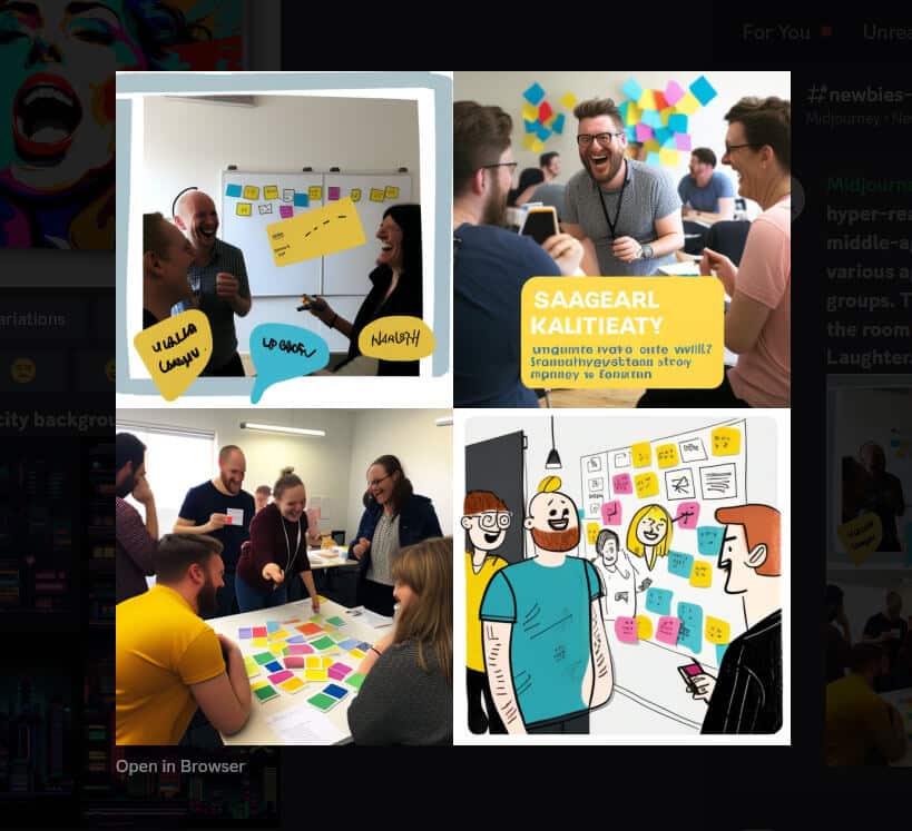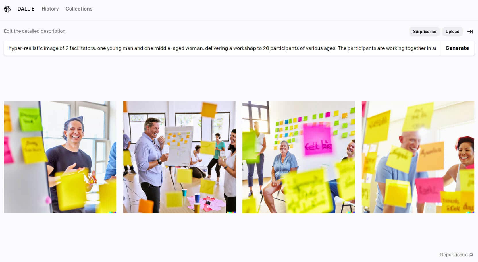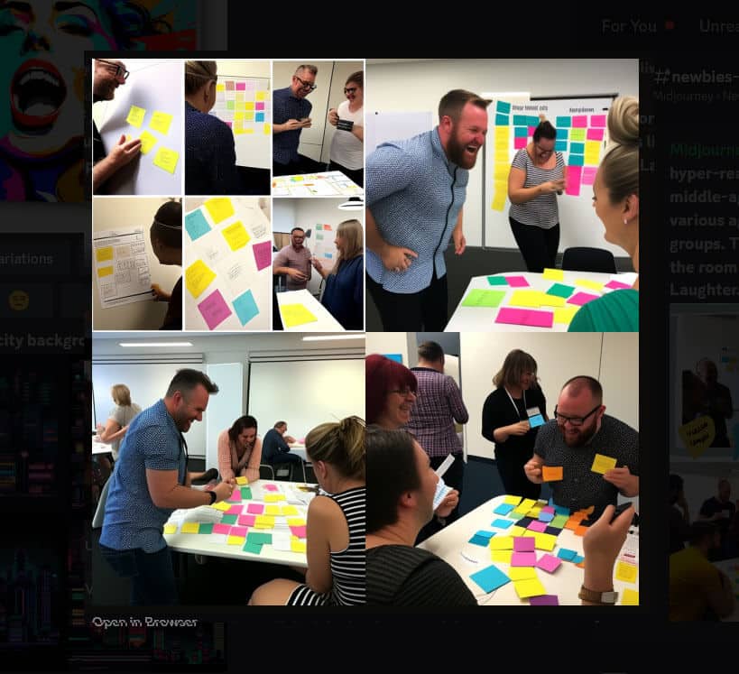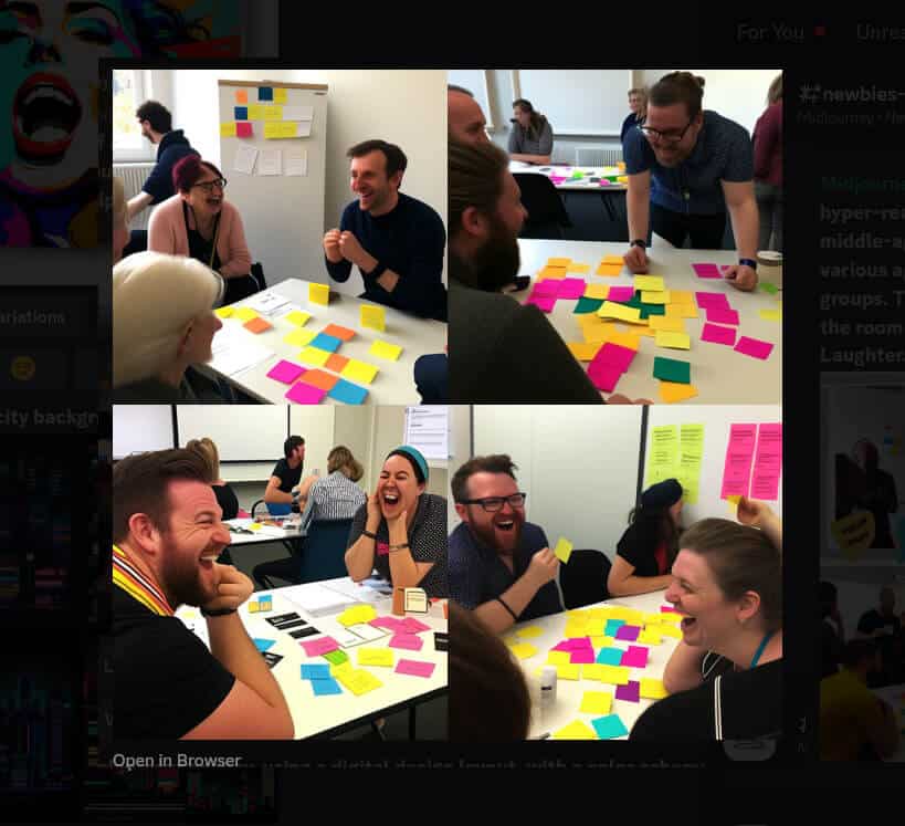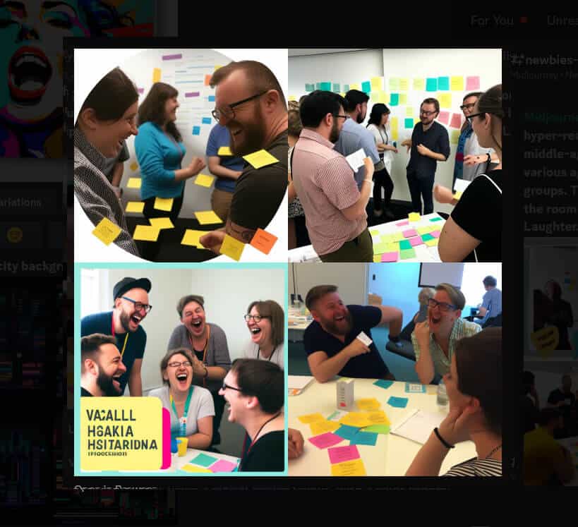 The prompt: hyper-realistic image of 2 facilitators, one young man and one middle-aged woman, delivering a workshop to 20 participants of various ages. The participants are working together in small groups. The room is light and bright. There are two flipchats in the room and lots of sticky notes on the walls. Colourful. Happy. Laughter.